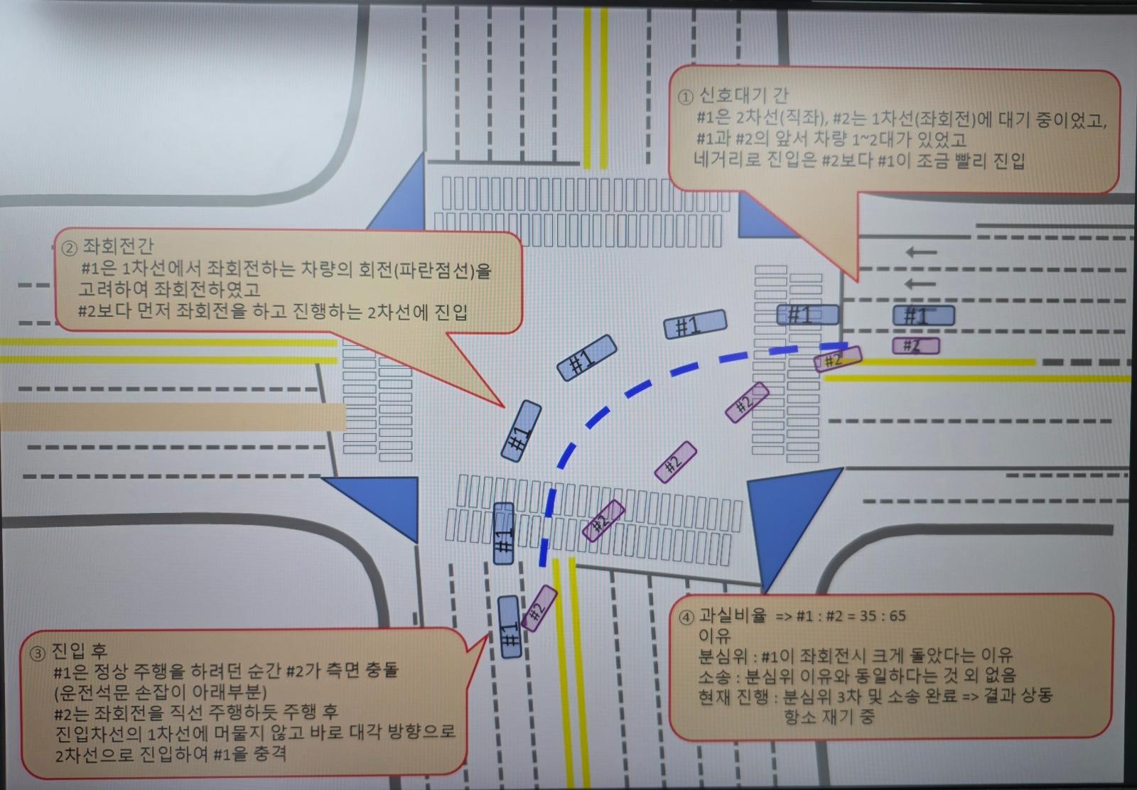 약 1년전 사고로 사거리 직좌신호를 받고 2차선(직좌, 방향지시등 켬)에어 2차선으로 좌회전한 후 1차선에서 차량이 2차선으로 바로 들어와 추돌 당한 사고입니다. 경찰에서는 1차선 차량이 가해차량으로 지정하여 벌금 조치를 하였고 상대방도 인정하였으나 상대 보험사(D*)에서 인정하지 않고 과실 35:65로 주장하여 제 보험사(AX*)에서 분심위를 갔으나 결과는 분심위 3회(과실 35%), 소송에서 과실35%로 판결되어 항소 요청하였습니다. 항소에서 이기기 위해 조금이나마 도움이 될까 한문철블랙박스에 제보하였으나 동일 내용이 이미 있으니 찾아서 필요한 정보 확인하라며 채택되지 않았습니다