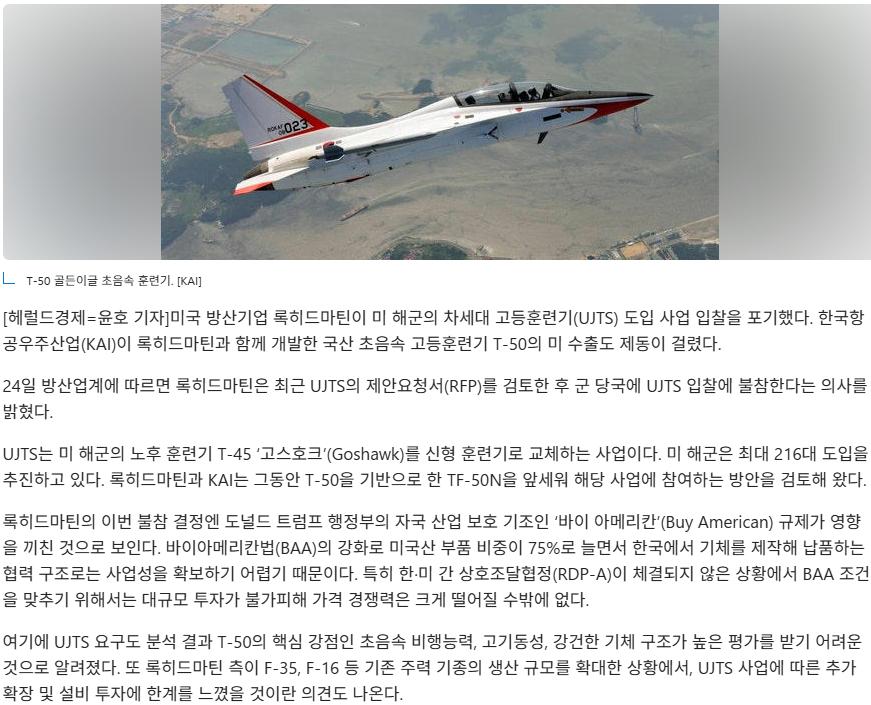 KAI가 T-50 미해군 고등훈련기 사업에 굉장히 공을 들였는데, 결국은 나가리 되네요.