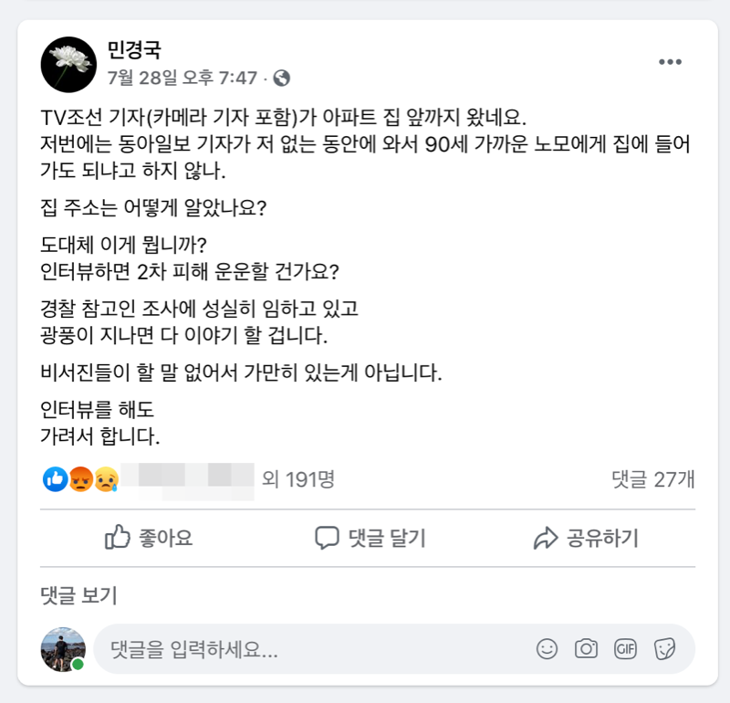 전 서울시 비서관 페북. "기자가 아파트 집앞까지 왔습니다." (11) 이미지 휴대전화 20.08.03 14:46 추천 97 조회 13197 시프겔 작성글보기 신고 댓글 광풍이 지나면 이야기할거다...하고픈말 많은데 참는듯 추천 97 본 게시물을 뉴스 및 기타 매체에서 인용하실 때는 '보배드림' 출처 표기를 부탁드립니다 페북 트윗 밴드 카톡 카스 복사 스크랩 삭제 수정 신고 불법광고신고 목록