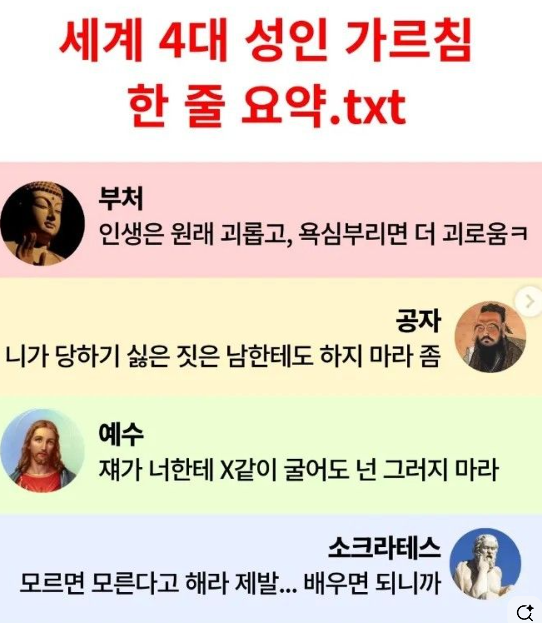세계4대 성인 가르침 한줄 요약. (5) 이미지 26.04.15 23:37 추천 34 조회 5520 곧휴꺄꺄 작성글보기 신고 댓글 추천 34 본 게시물을 뉴스 및 기타 매체에서 인용하실 때는 '보배드림' 출처 표기를 부탁드립니다 페북 트윗 밴드 카톡 카스 복사 스크랩 삭제 수정 신고 불법광고신고 목록