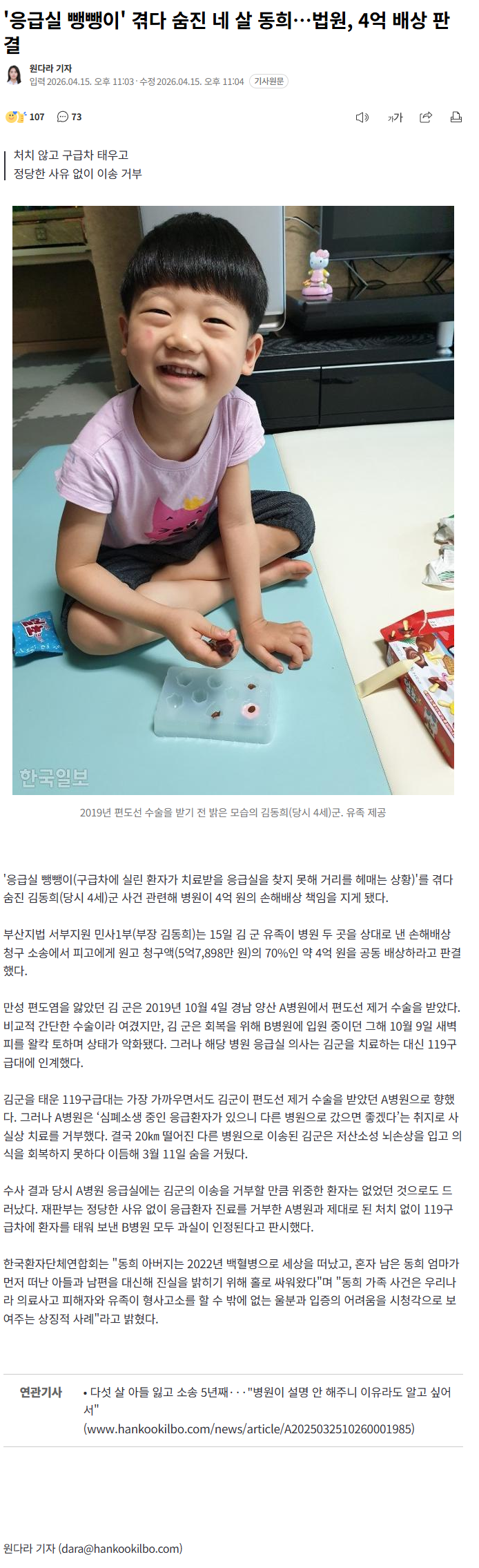 '응급실 뺑뺑이' 겪다 숨진 네 살 동희…법원, 4억 배상 (8) 이미지 26.04.16 09:10 추천 41 조회 3295 진햅 작성글보기 신고 댓글 https://n.news.naver.com/article/469/0000925695?ntype=RANKING저아이는 저렇게 행복한데 슬프네요 ㅠㅠ 추천 41 본 게시물을 뉴스 및 기타 매체에서 인용하실 때는 '보배드림' 출처 표기를 부탁드립니다 페북 트윗 밴드 카톡 카스 복사 스크랩 삭제 수정 신고 불법광고신고 목록