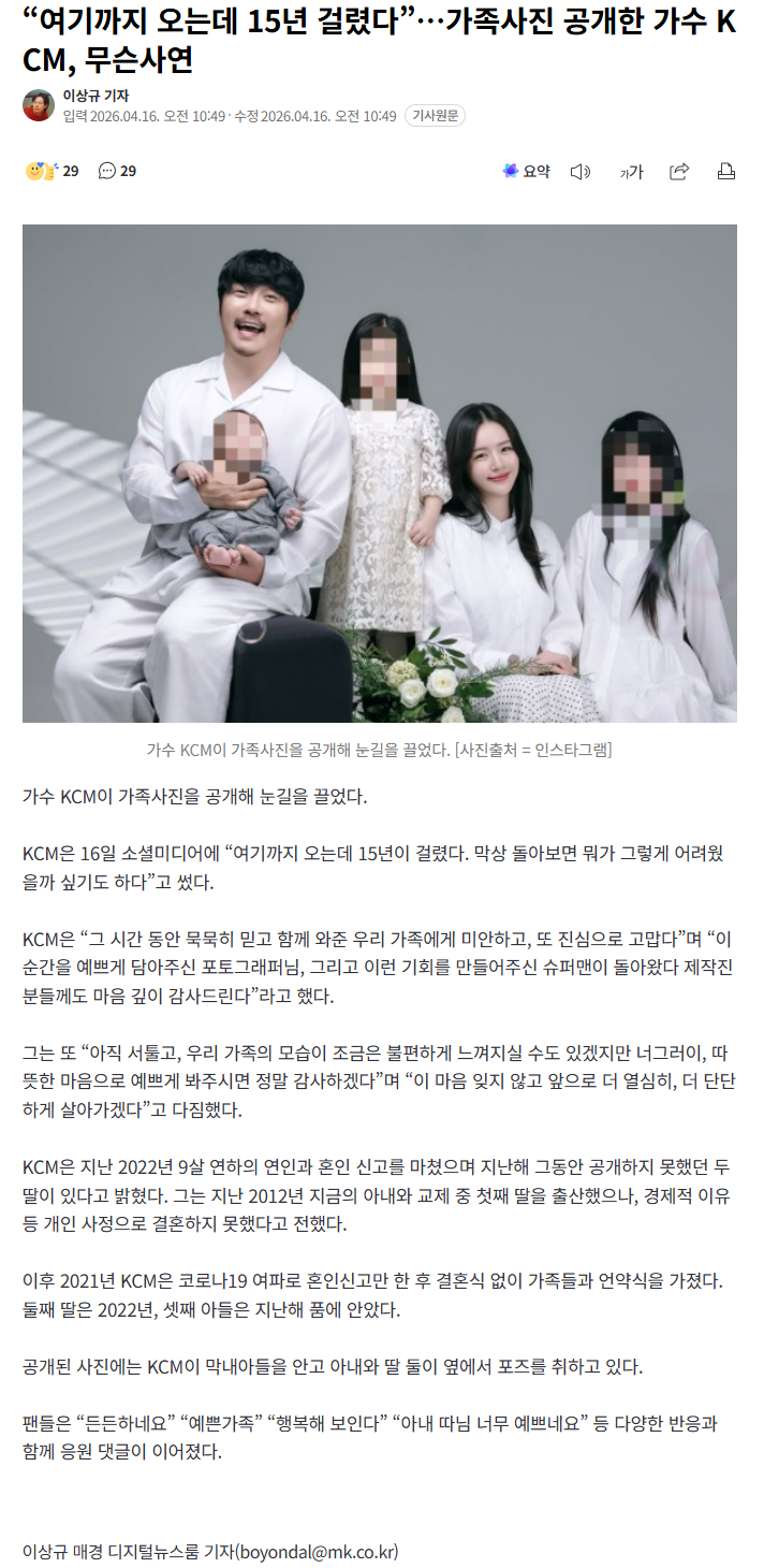 여기까지 오는데 15년 걸렸다 가족사진 공개한가수 KCM (4) 이미지 26.04.16 14:41 추천 25 조회 1659 진햅 작성글보기 신고 댓글 https://n.news.naver.com/article/009/0005666779?ntype=RANKING항상 행복하셨으면 좋겠네요 ~~~~ 추천 25 본 게시물을 뉴스 및 기타 매체에서 인용하실 때는 '보배드림' 출처 표기를 부탁드립니다 페북 트윗 밴드 카톡 카스 복사 스크랩 삭제 수정 신고 불법광고신고 목록