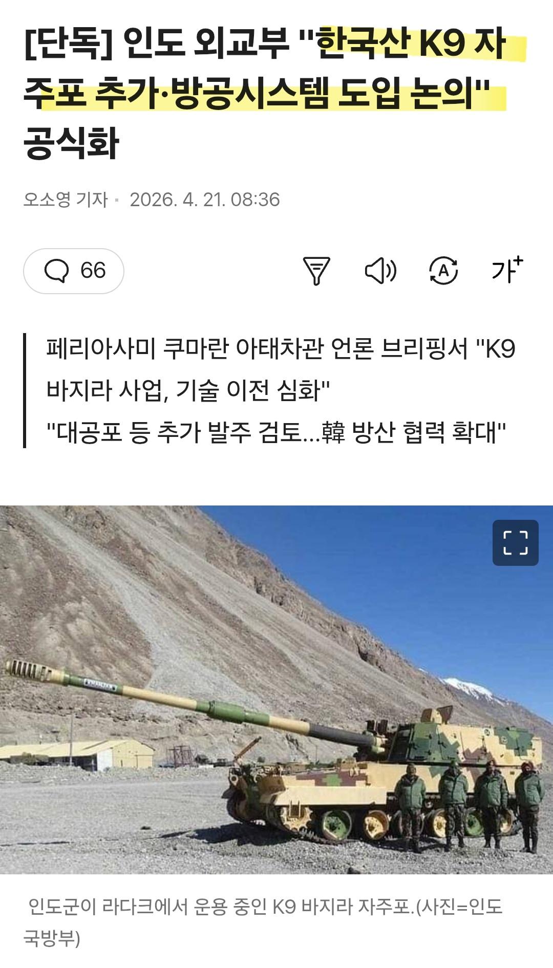 인도 외교부...한국산 K9 자주포, 방공시스템 도입 논의 (10) 이미지 휴대전화 14:23 추천 116 조회 7444 wonder2569 작성글보기 신고 댓글 인도는 이미 K9 자주포 사용하고 있죠, 써보니 좋은가 보군요, https://v.daum.net/v/20260421083603790 추천 116 본 게시물을 뉴스 및 기타 매체에서 인용하실 때는 '보배드림' 출처 표기를 부탁드립니다 페북 트윗 밴드 카톡 카스 복사 스크랩 삭제 수정 신고 불법광고신고 목록