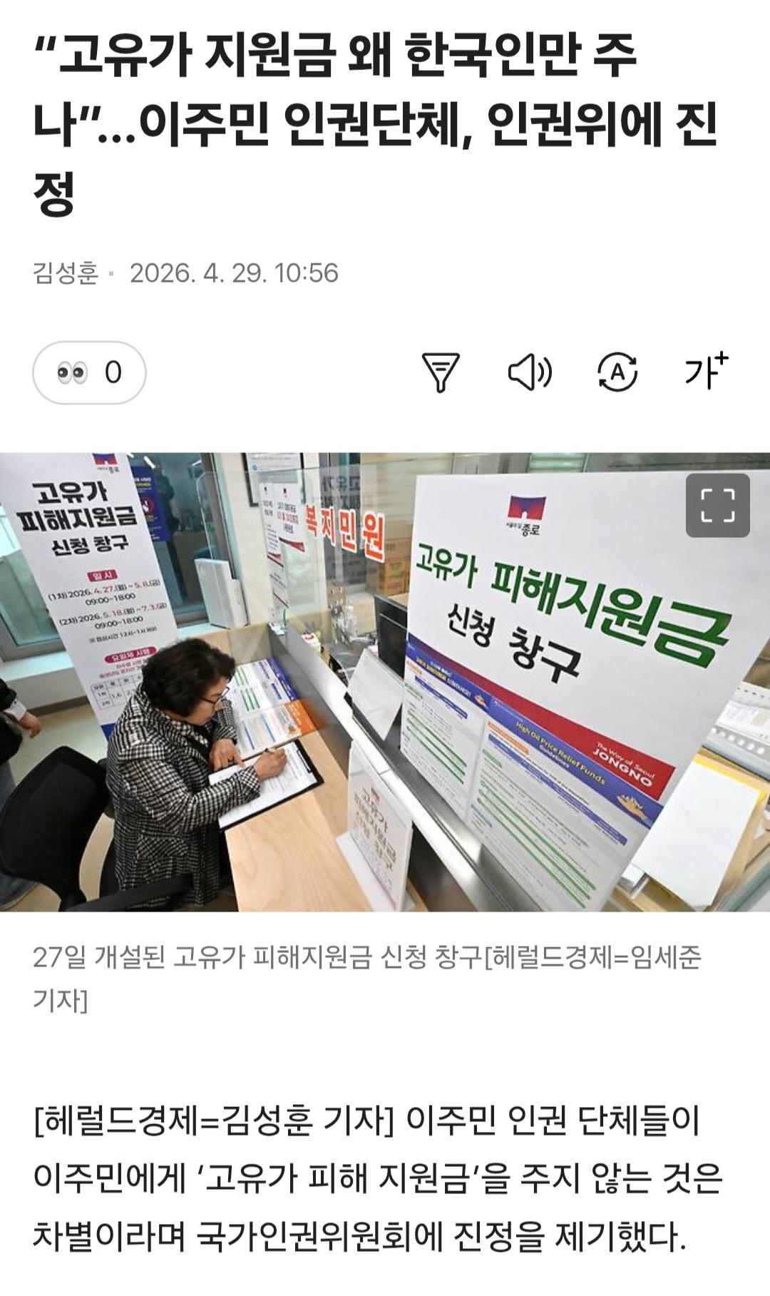 고유가 피해지원금...이주민 다 달라 인권위 진정 (49) 이미지 휴대전화 26.04.29 12:21 추천 144 조회 10690 wonder2569 작성글보기 신고 댓글 결혼이민자. 영주권자. 난민 인정자 다 줌... 세금 많이 내고도 못 받는 국민이 30%임. 받는 국민들 중에서도 꼴랑 10만원 받는 국민도 많은데 나도 달라는 말이 나오나? 추천 144 본 게시물을 뉴스 및 기타 매체에서 인용하실 때는 '보배드림' 출처 표기를 부탁드립니다 페북 트윗 밴드 카톡 카스 복사 스크랩 삭제 수정 신고 불법광고신고 목록