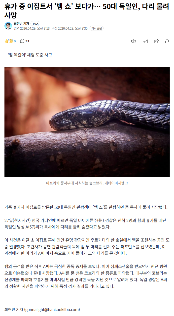 휴가 중 이집트서 '뱀 쇼' 보다가… 50대 독일인 사망 (6) 이미지 26.04.29 11:31 추천 19 조회 1240 진햅 작성글보기 신고 댓글 https://n.news.naver.com/article/469/0000928146?ntype=RANKING뱀 목걸이 체험도중 물려서 사망.. ㄷㄷ 무섭네요 추천 19 본 게시물을 뉴스 및 기타 매체에서 인용하실 때는 '보배드림' 출처 표기를 부탁드립니다 페북 트윗 밴드 카톡 카스 복사 스크랩 삭제 수정 신고 불법광고신고 목록
