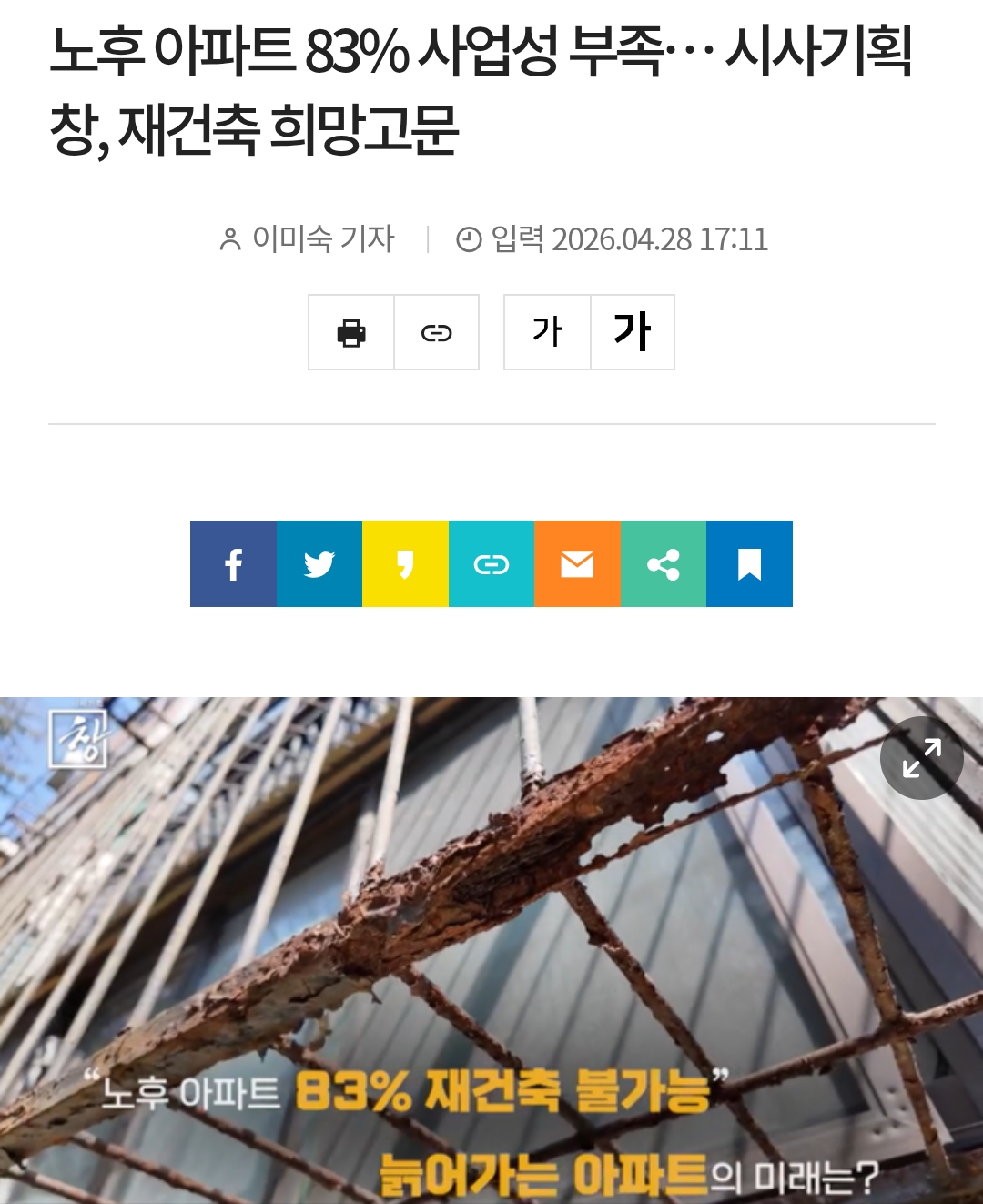아파트 재건축의 역습 ㄷㄷㄷ (15) 이미지 휴대전화 26.04.30 04:40 추천 46 조회 11642 나라간다 작성글보기 신고 댓글 노후 아파트 83% 재건축 불가능 ㄷㄷㄷ 추천 46 본 게시물을 뉴스 및 기타 매체에서 인용하실 때는 '보배드림' 출처 표기를 부탁드립니다 페북 트윗 밴드 카톡 카스 복사 스크랩 삭제 수정 신고 불법광고신고 목록