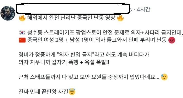 성수동 중국인 난동 영상 (43) 이미지 26.04.30 15:23 추천 170 조회 19272 사패산꼴데 작성글보기 신고 댓글 추천 170 본 게시물을 뉴스 및 기타 매체에서 인용하실 때는 '보배드림' 출처 표기를 부탁드립니다 페북 트윗 밴드 카톡 카스 복사 스크랩 삭제 수정 신고 불법광고신고 목록