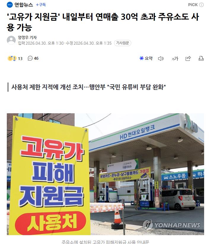 '고유가 지원금' 내일부터 연매출 30억 초과 주유소도 사용 가능 (6) 이미지 26.04.30 14:05 추천 25 조회 1312 jackbauer 작성글보기 신고 댓글 추천 25 본 게시물을 뉴스 및 기타 매체에서 인용하실 때는 '보배드림' 출처 표기를 부탁드립니다 페북 트윗 밴드 카톡 카스 복사 스크랩 삭제 수정 신고 불법광고신고 목록