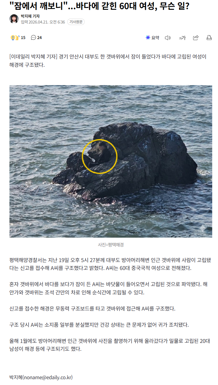 "잠에서 깨보니"...바다에 갇힌 60대 여성, 무슨 일? (8) 이미지 26.04.21 08:21 추천 10 조회 2259 진햅 작성글보기 신고 댓글 https://n.news.naver.com/article/018/0006262203?ntype=RANKING 생각없는 사람이네요 에휴 .. 추천 10 본 게시물을 뉴스 및 기타 매체에서 인용하실 때는 '보배드림' 출처 표기를 부탁드립니다 페북 트윗 밴드 카톡 카스 복사 스크랩 삭제 수정 신고 불법광고신고 목록