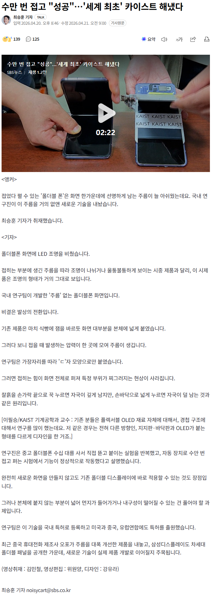 수만 번 접고 "성공"…'세계 최초' 카이스트 해냈다 (4) 이미지 26.04.21 09:10 추천 34 조회 4915 진햅 작성글보기 신고 댓글 https://n.news.naver.com/article/055/0001350005?ntype=RANKING대단하십니다 !!! 추천 34 본 게시물을 뉴스 및 기타 매체에서 인용하실 때는 '보배드림' 출처 표기를 부탁드립니다 페북 트윗 밴드 카톡 카스 복사 스크랩 삭제 수정 신고 불법광고신고 목록