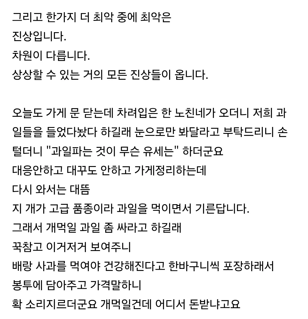 과일가게 사장님의 일상 (13) 이미지 26.04.21 13:36 추천 105 조회 11237 나아닌너 작성글보기 신고 댓글 추천 105 본 게시물을 뉴스 및 기타 매체에서 인용하실 때는 '보배드림' 출처 표기를 부탁드립니다 페북 트윗 밴드 카톡 카스 복사 스크랩 삭제 수정 신고 불법광고신고 목록