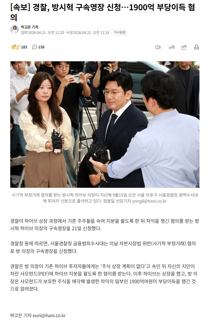 경찰, 방시혁 구속영장 신청…1900억 부당이득 혐의 (2) 이미지 26.04.21 14:05 추천 9 조회 1225 진햅 작성글보기 신고 댓글 https://n.news.naver.com/article/028/0002801675?ntype=RANKING 1900억 덜덜이네요 ... 추천 9 본 게시물을 뉴스 및 기타 매체에서 인용하실 때는 '보배드림' 출처 표기를 부탁드립니다 페북 트윗 밴드 카톡 카스 복사 스크랩 삭제 수정 신고 불법광고신고 목록