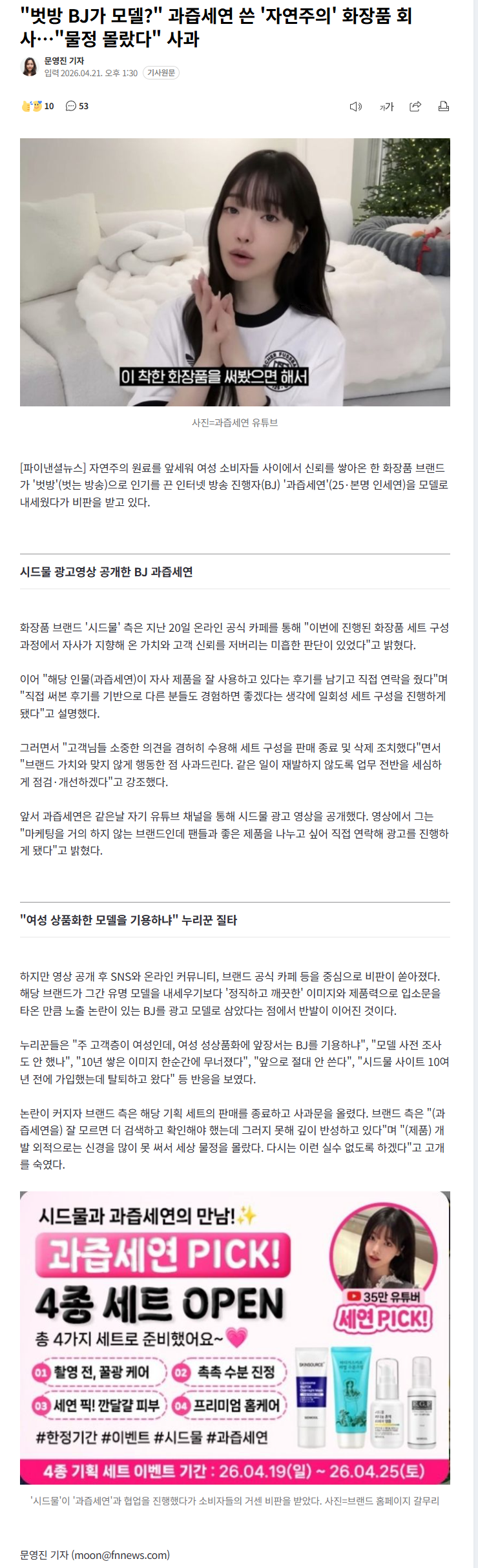 "벗방 BJ가 모델?" 과즙세연 쓴 '자연주의' 화장품 (9) 이미지 26.04.21 15:28 추천 13 조회 3032 진햅 작성글보기 신고 댓글 https://n.news.naver.com/article/014/0005510952?ntype=RANKING 추천 13 본 게시물을 뉴스 및 기타 매체에서 인용하실 때는 '보배드림' 출처 표기를 부탁드립니다 페북 트윗 밴드 카톡 카스 복사 스크랩 삭제 수정 신고 불법광고신고 목록