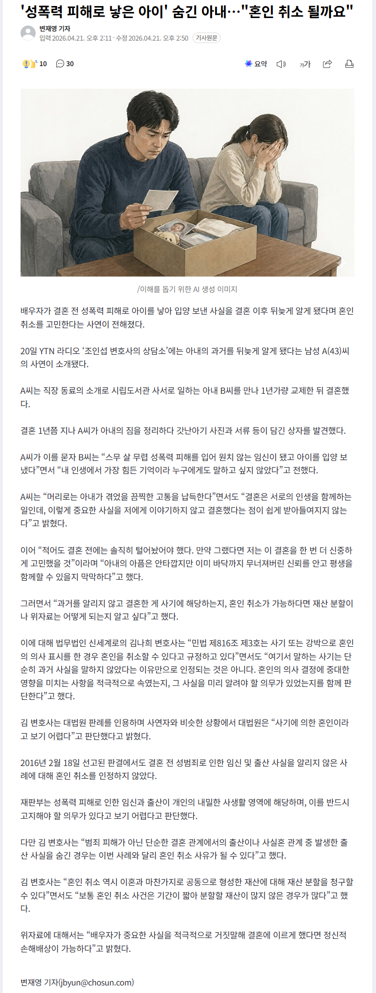 '성폭력 피해로 낳은 아이' 숨긴 아내…"혼인 취소 될까요" (8) 이미지 26.04.21 16:10 추천 7 조회 1803 진햅 작성글보기 신고 댓글 https://n.news.naver.com/article/448/0000605588?ntype=RANKING 추천 7 본 게시물을 뉴스 및 기타 매체에서 인용하실 때는 '보배드림' 출처 표기를 부탁드립니다 페북 트윗 밴드 카톡 카스 복사 스크랩 삭제 수정 신고 불법광고신고 목록