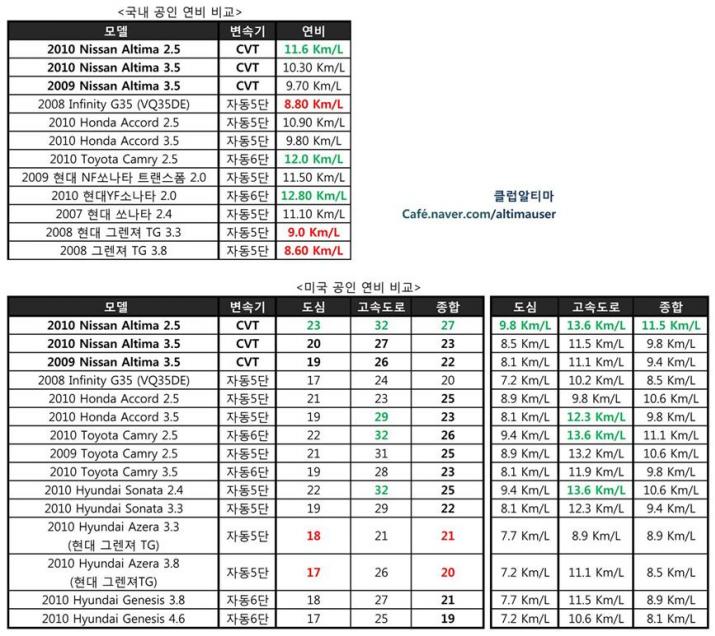 궁금해서 만들어본 알티마와 동급차량들의 공인 연비 비교표입니다. 비교해보시면 CVT의 공인연비가 6단을 채용한 자동변속기보다는 확실히 연비가 좋은거를 확인하실수 있습니다. 국산 공인연비보다 City/Highway 로 나눠서 테스트 하는 미쿡 공인연비가 좀더 정확한거 같습니다.