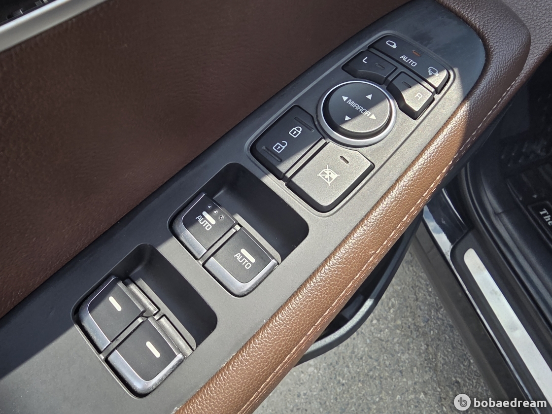 상단과 도어 상단을 연결한 랩어라운드 스타일을 통해 실내의 통일감을 연출한다. 도어트림의 윈도우 스위치는