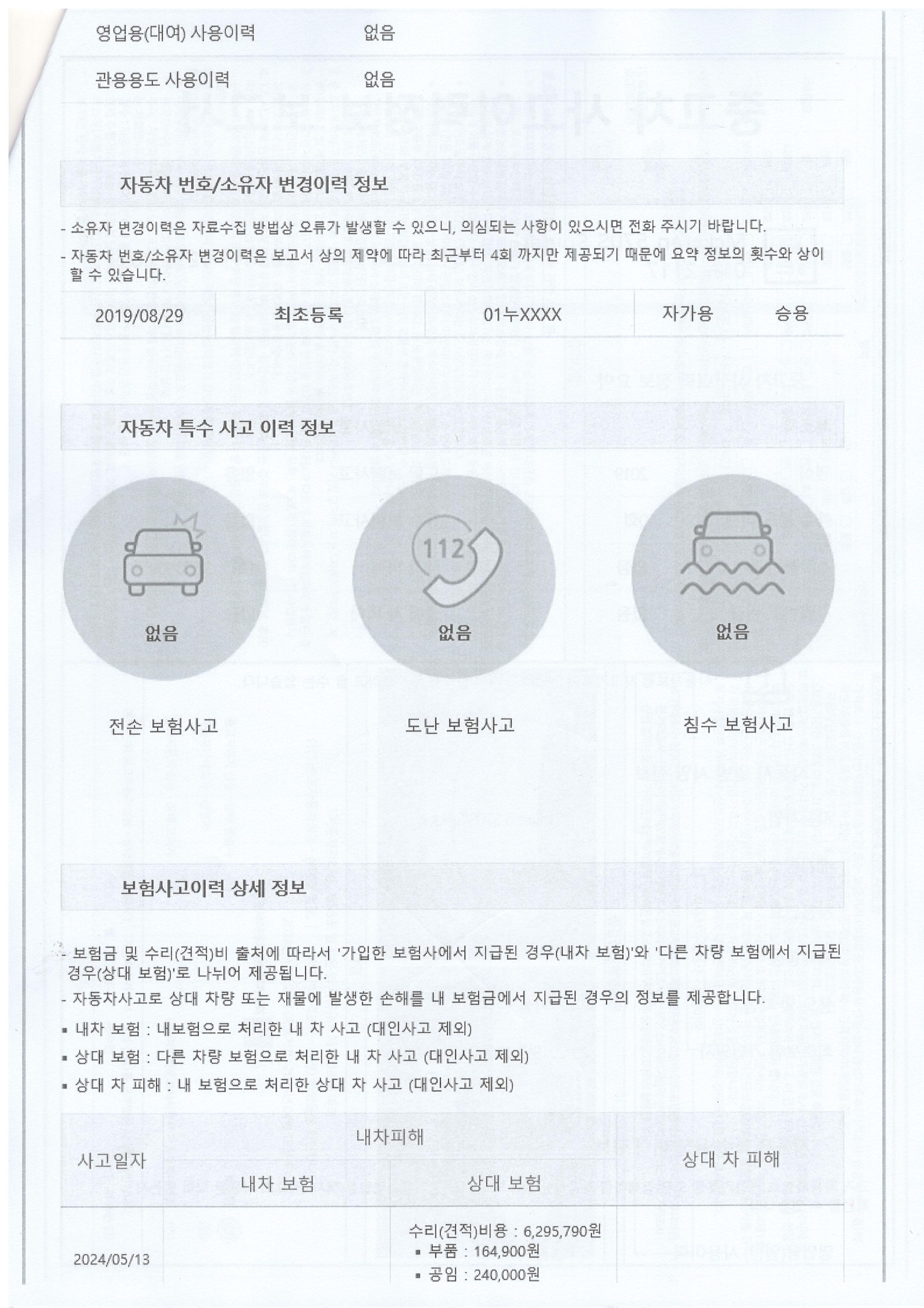 - 보험이력 1건은 1대 차주가 소유 중에, 주차 중 이웃 주민의 경미 접촉으로 인해 정식 센터에서