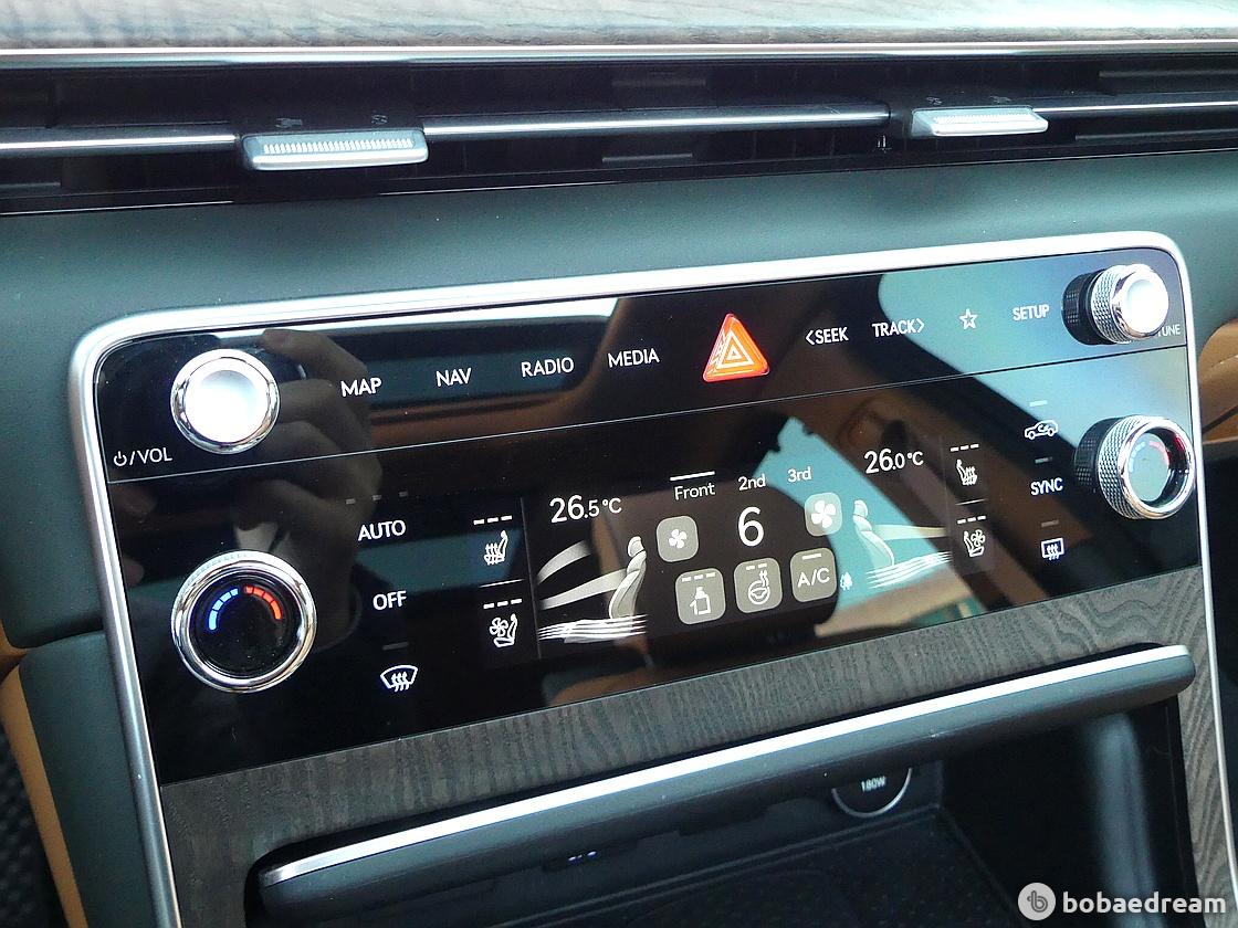 센터페시아는 심리스한 디자인을 적용해 고급스러운 감성을 더하는 한편 터치 타입 공조 장치를 적용해