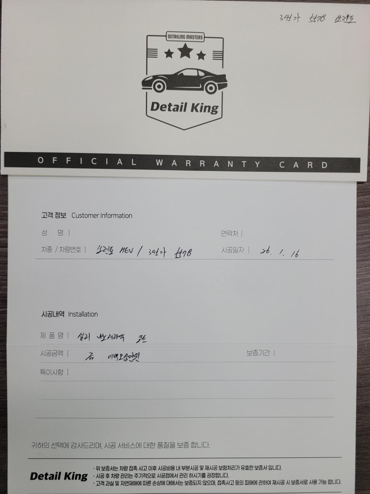 - 디테일킹 셀리 나노세라믹 코트 작업차량_보증서 보유