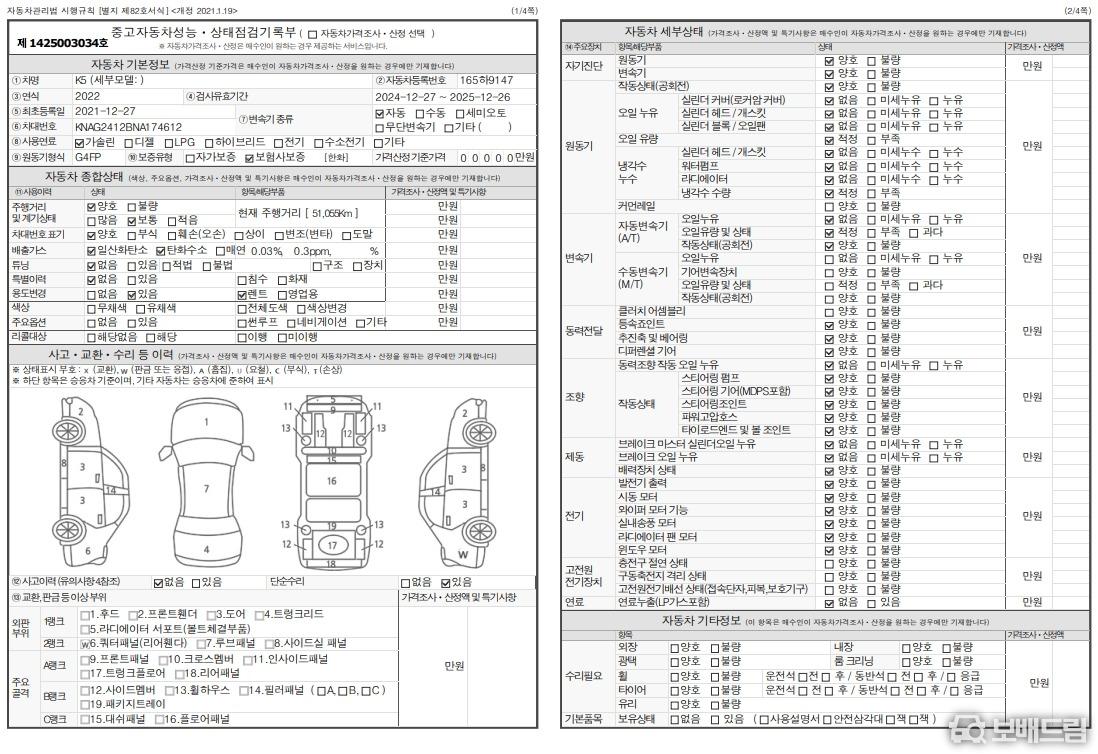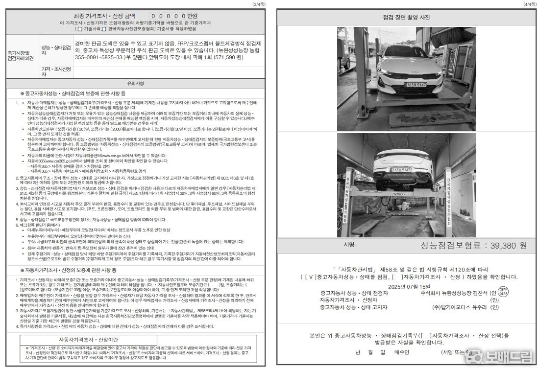 성능지는 해당 매물의 성능점검 기록부의 이미지 입니다.
