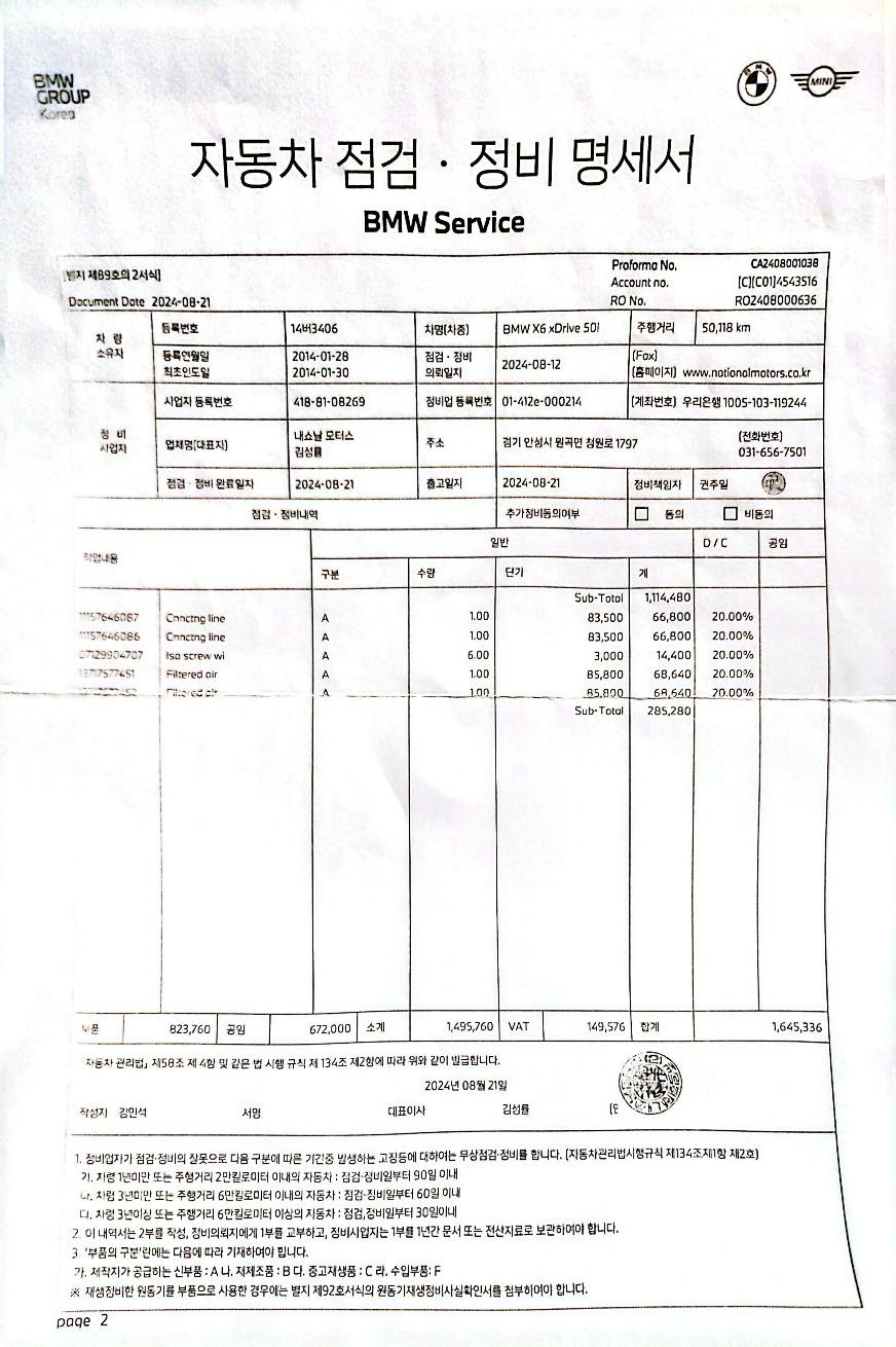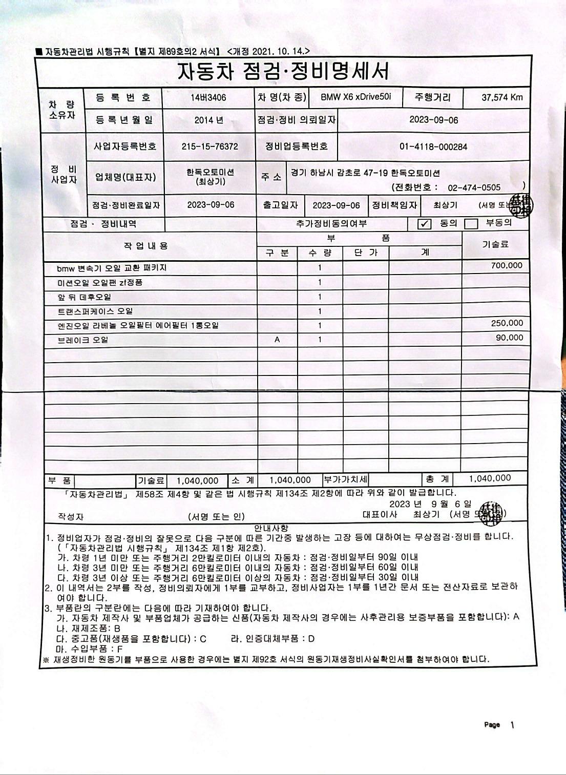 》미션오일은 한독오토미션 - BMW내쇼날모터스 평택서비스센터에서 관리