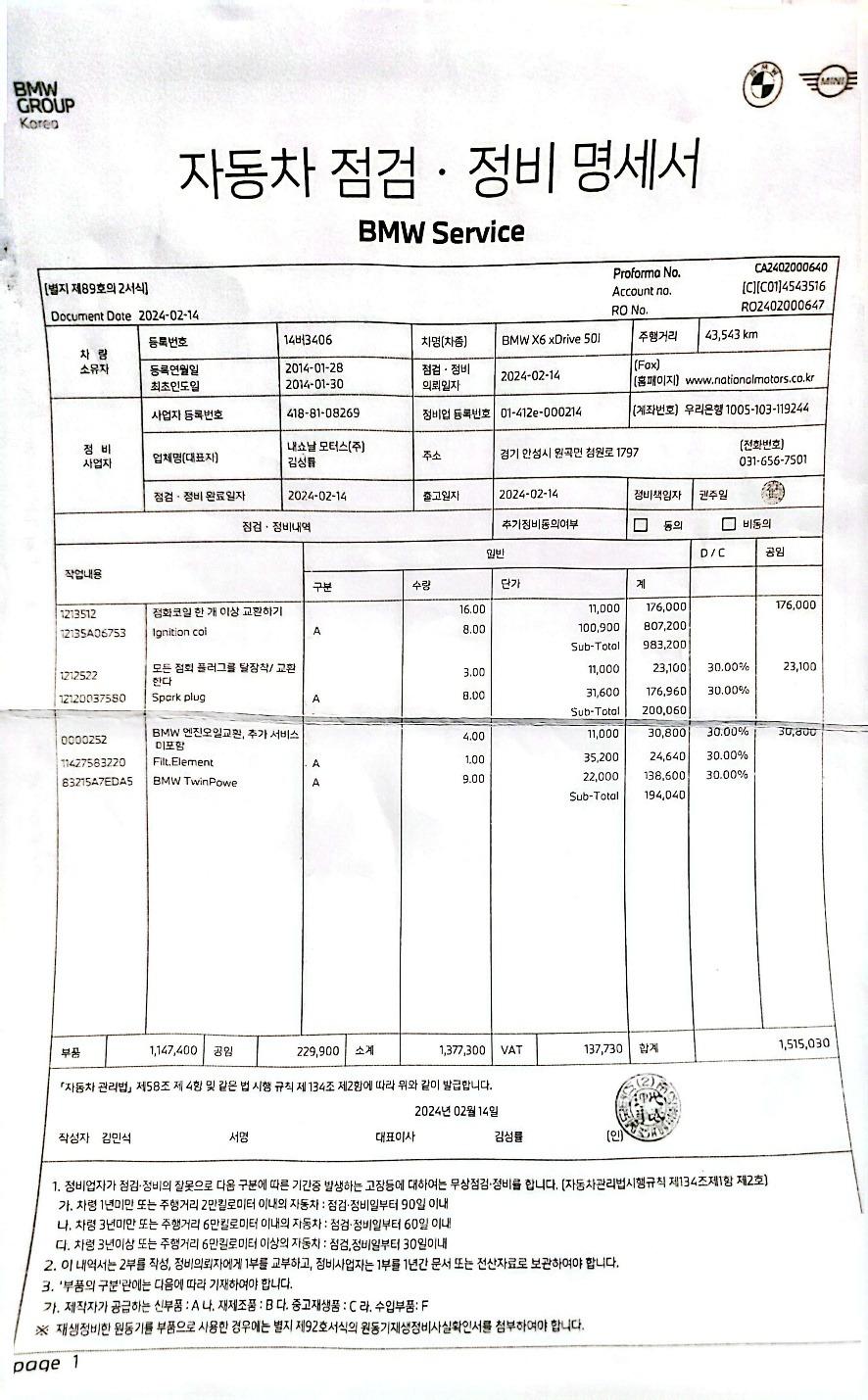 (2024년 2월 - 43,543km) / 점화코일-플러그 교환 , 엔진오일 교환