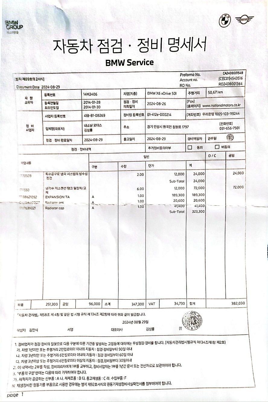 (2024년 8월 - 50,671km) / 냉각수 익스팬션 탱크 교환