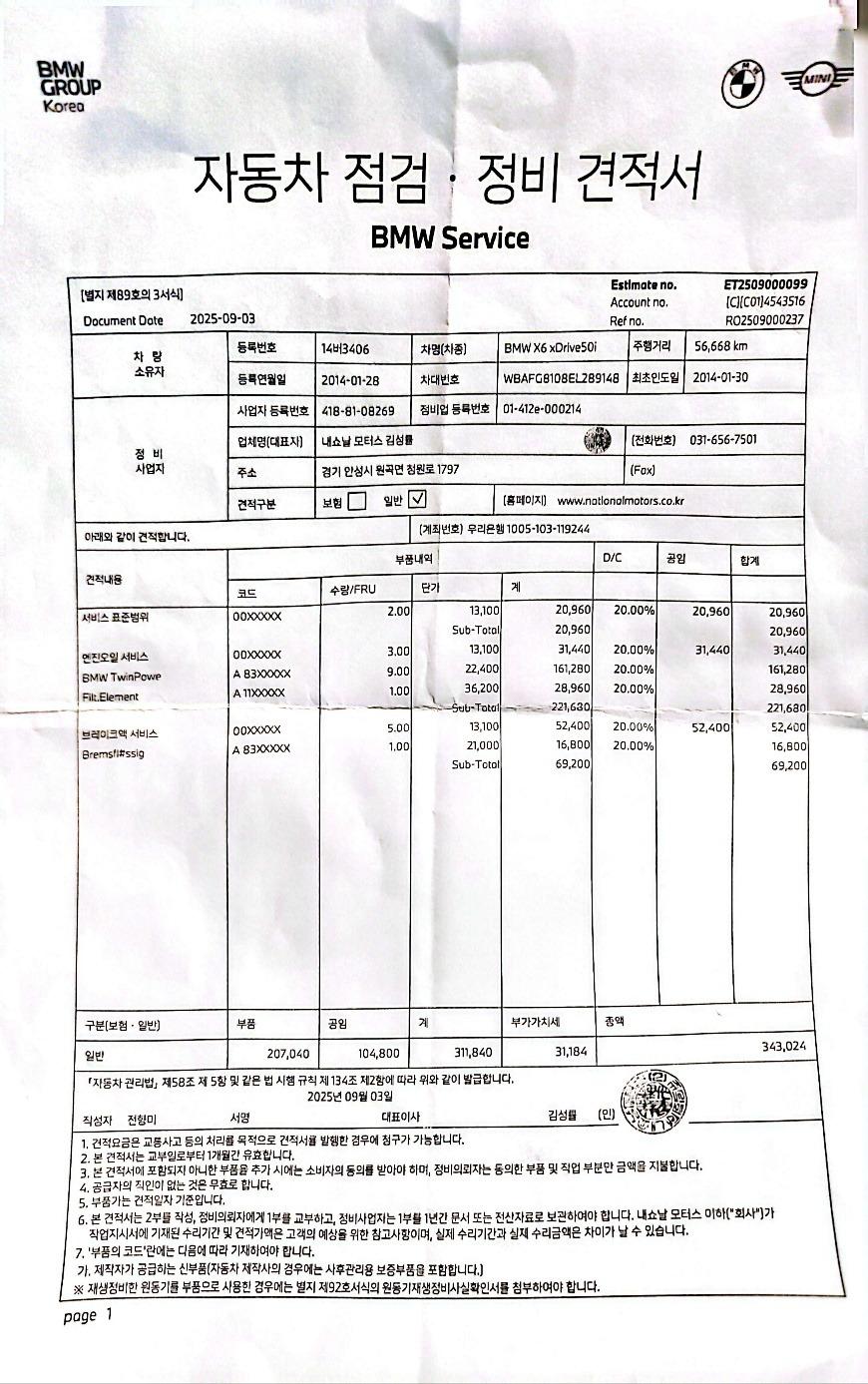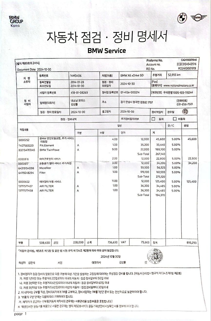 (2024년 10월 - 52,955km) / 엔진오일 , 마이크로필터 , 에어필터 교환