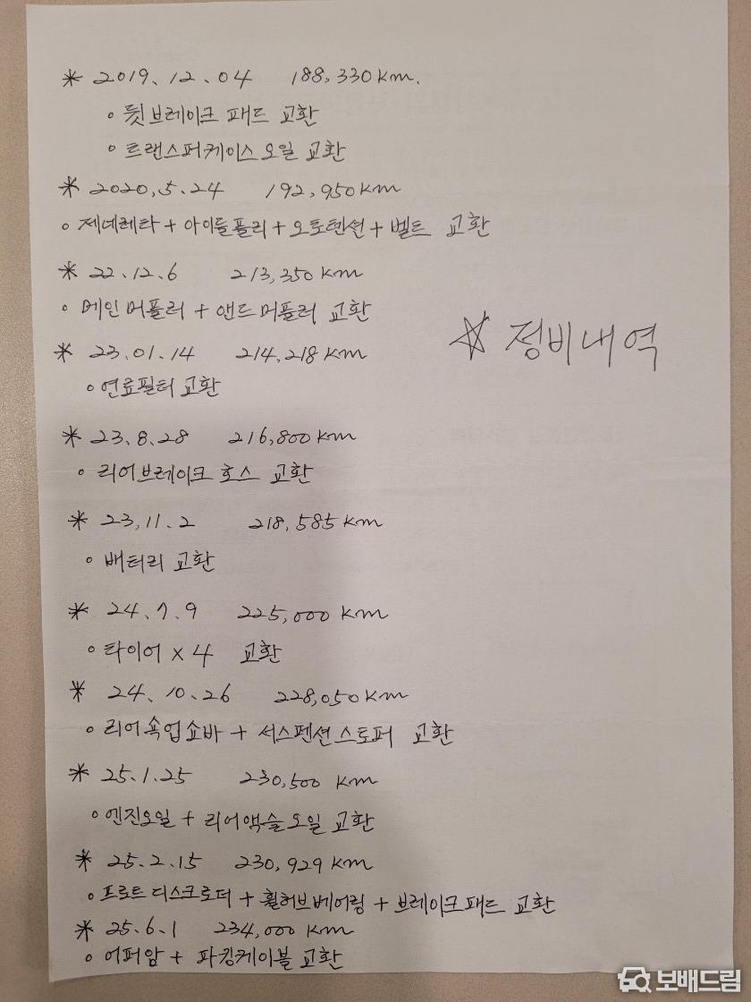 2019년에 중고로 구매하여(187000km) 꾸준히 정비,관리 하며 이용했습니다(정비내역 올립니다)